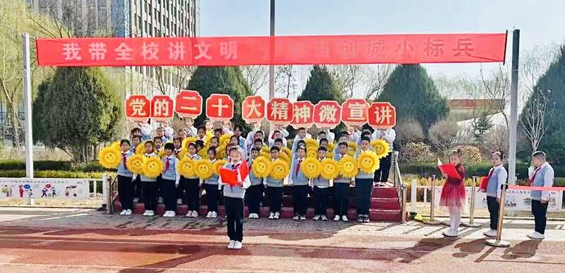 3月5日,吴忠市利通区第九小学少先队员参加“我带全校讲文明,争做创城小标兵”党的二十大主题微宣讲活动。