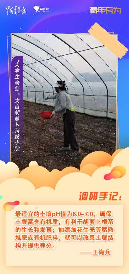王海兵除了是科技小院的“院长”,也是青岛农业大学资源利用与植物保护专业2022级研究生,“我们是否可以结合自身专业,提高土壤肥力,改善土壤,提升胡萝卜的品质指标和养分含量呢?”她和同学们开始琢磨,怎么把调研发现的乡亲们的种植痛点和自己的专业所学结合起来。