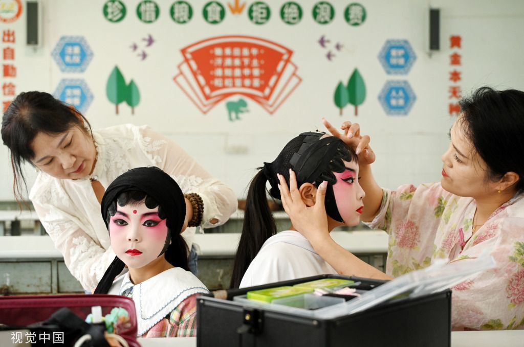 2023年9月1日,浙江金华,开学第一课,武义县新宅镇中心小学把婺剧、竹竿舞搬进课堂,让小朋友近距离感受婺剧地方戏和畲族传统文化的魅力。