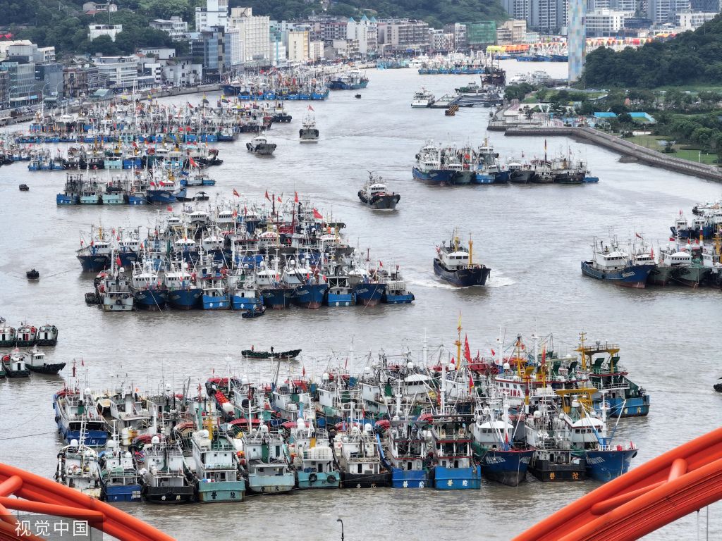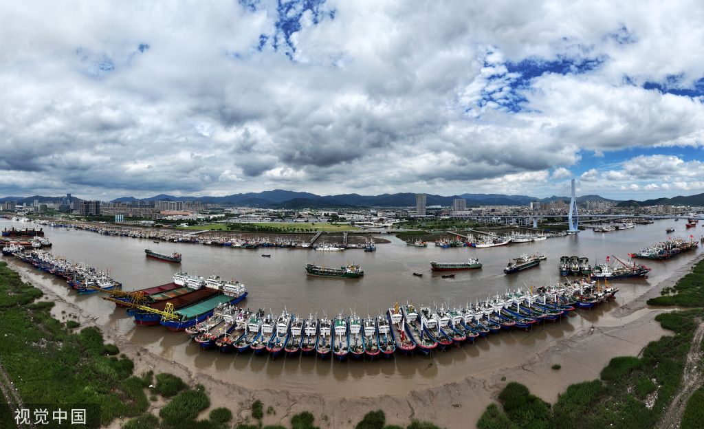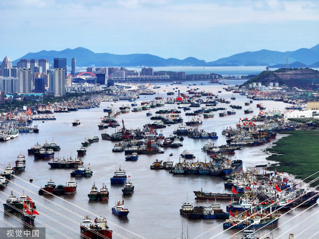 2023年8月31日中午,浙江舟山,受台风“海葵”影响,普陀区沈家门街道十里渔港内泊满了回港避风的大小渔船。