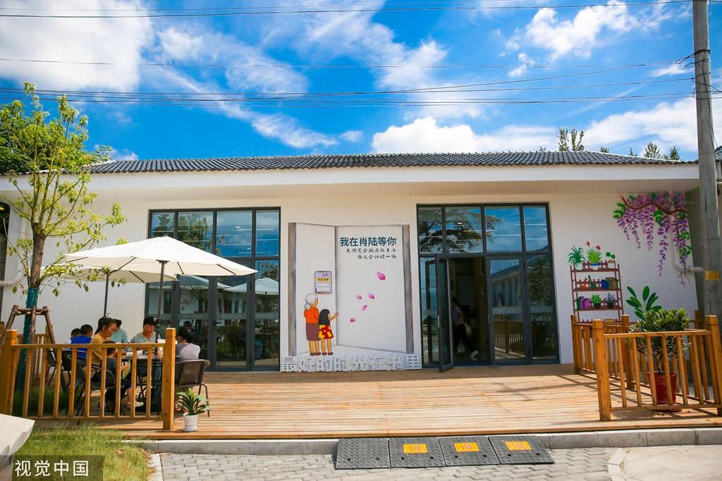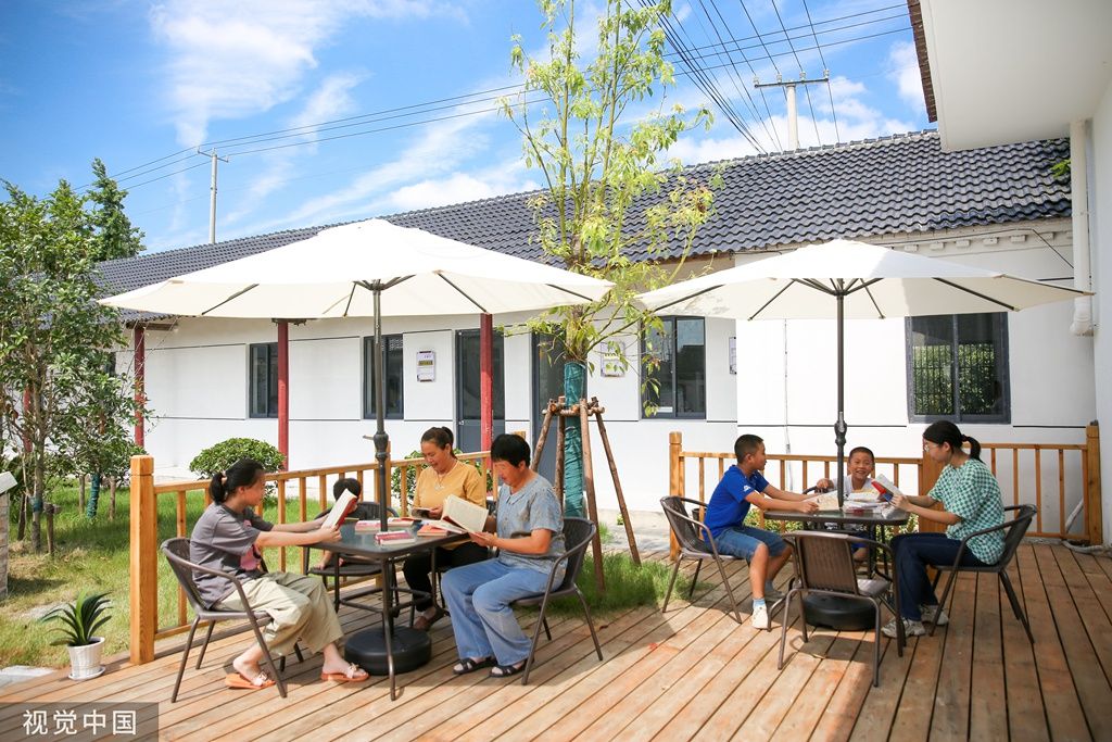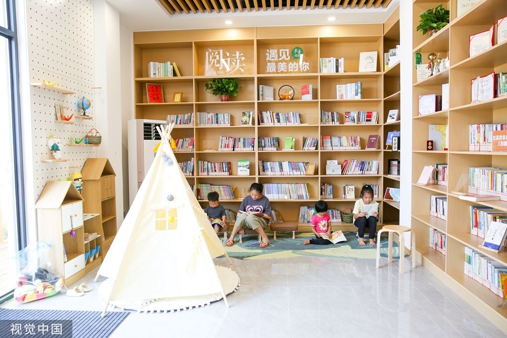 2023年9月2日,江苏南通,如皋市城南街道肖陆村,小朋友和村民在提档升级后的农家书屋长廊阅读图书。