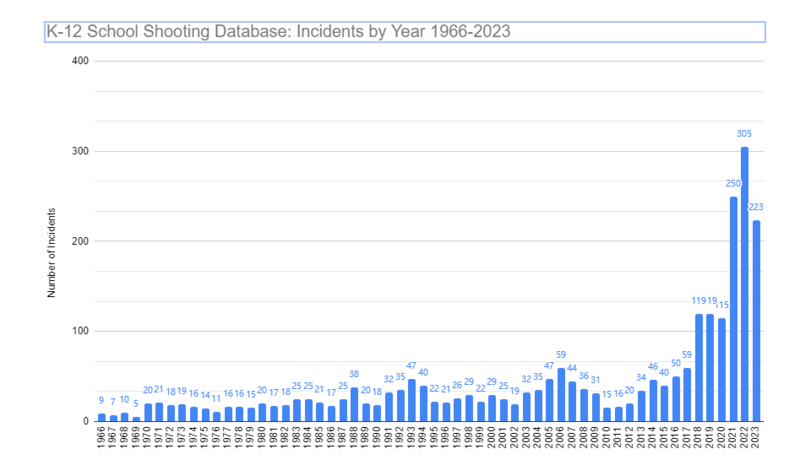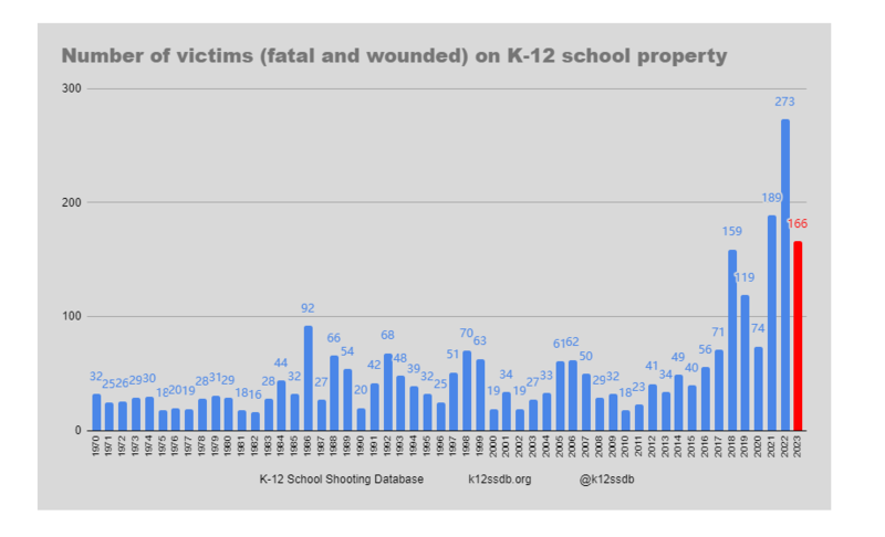 美国枪支暴力痼疾难除,美国校园的枪声也从未停歇,一个个鲜活的生命也随之流逝。根据K-12学校枪击案数据库(K-12 School Shooting Database)显示,美国至今校园枪击事件已超过200起,伤亡人数高达166人。