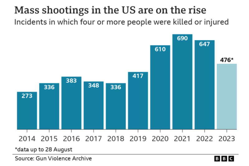 英国广播公司(BBC)援引美国“枪支暴力档案”网站数据称,今年到目前为止,美国已经发生了470多起大规模枪击事件,在过去的三年里,每年都有600多起大规模枪击事件,几乎平均每天发生两起。美国每天都有50多人死于枪支。