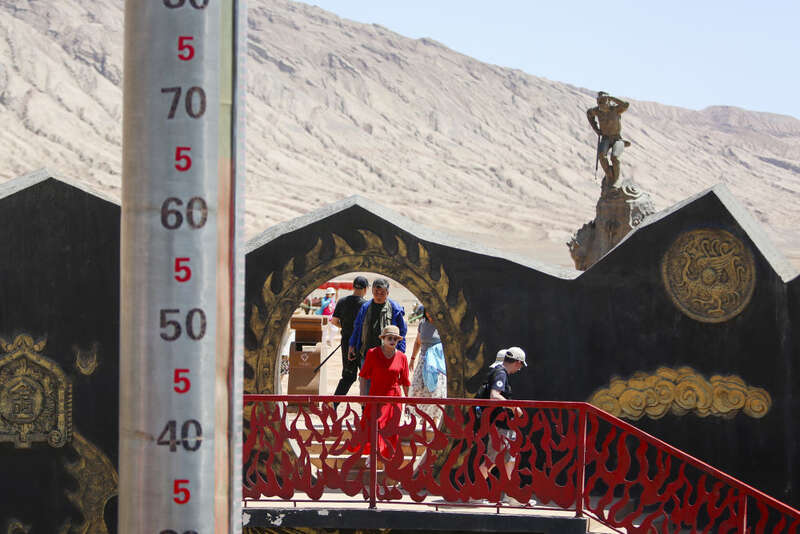 游客在位于新疆吐鲁番的火焰山景区游玩(2023年6月27日摄)。新华社记者 郝昭 摄