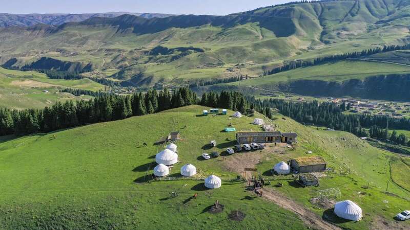 新疆特克斯县喀拉达拉镇琼库什台村的一处“牧家乐”(无人机照片,2019年8月13日摄)。新华社记者 胡虎虎 摄