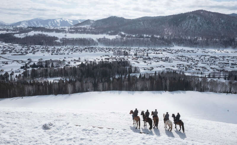 新疆阿勒泰地区禾木村观光马队农民专业合作社队员骑马走在禾木村后山的观景平台上(无人机照片,2023年3月30日摄)。新华社记者 李响 摄