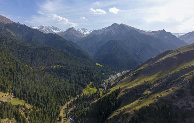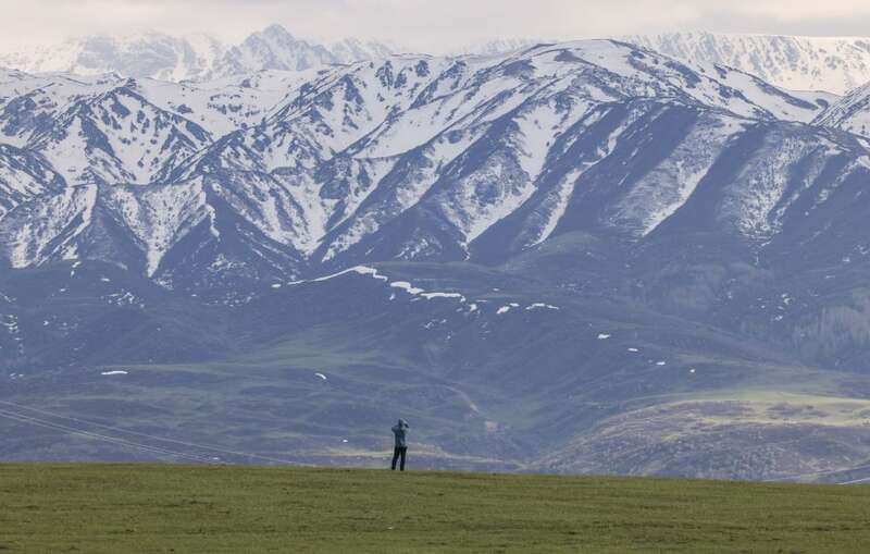 游客在新疆塔城地区裕民县巴尔鲁克山区拍摄风景(2023年5月2日摄)。新华社发(张度 摄)