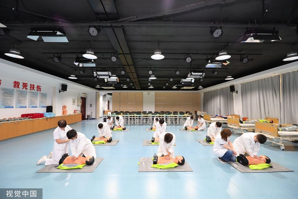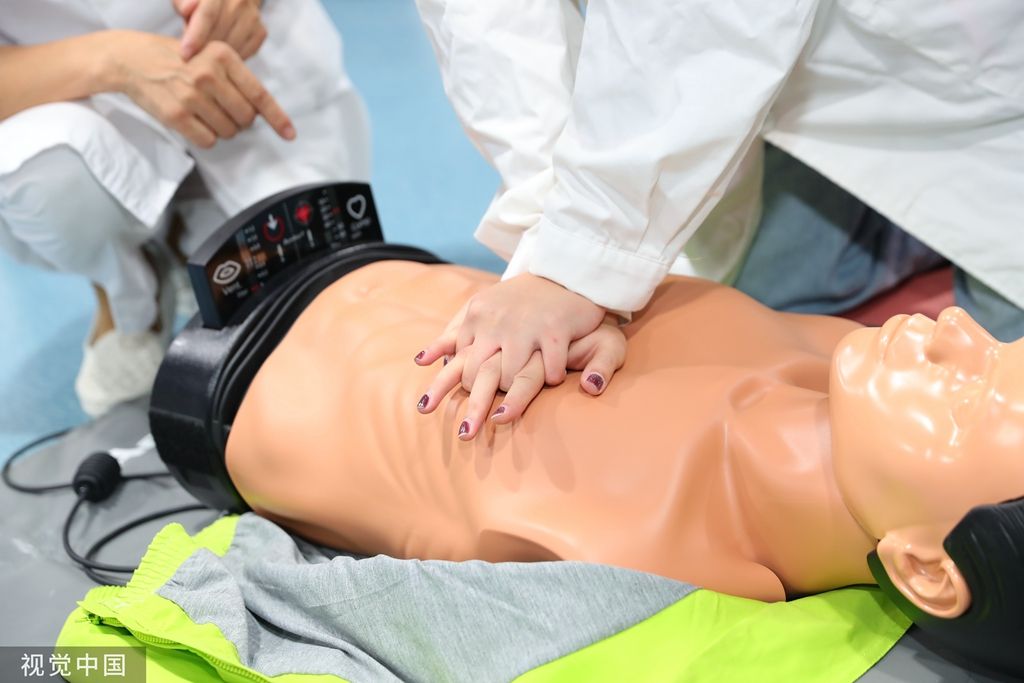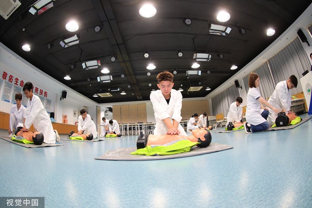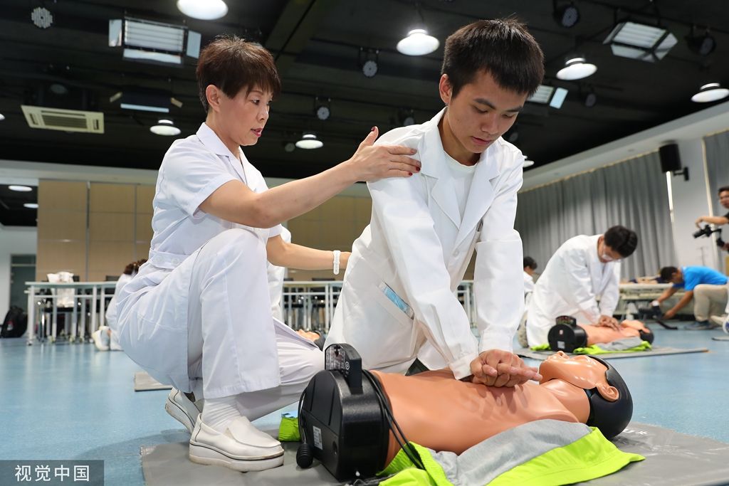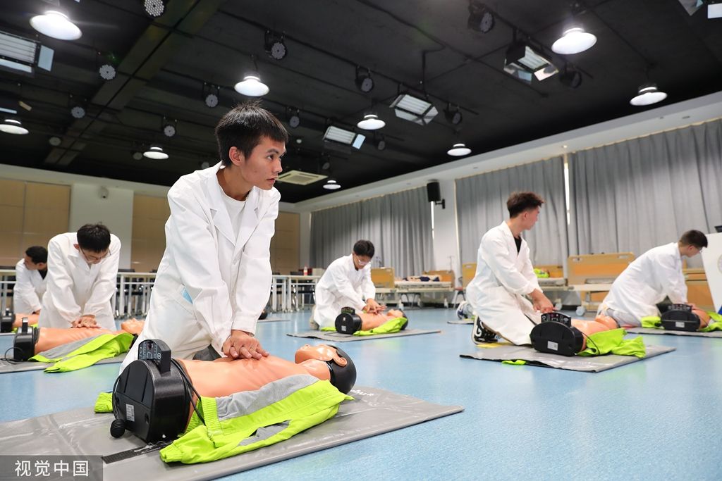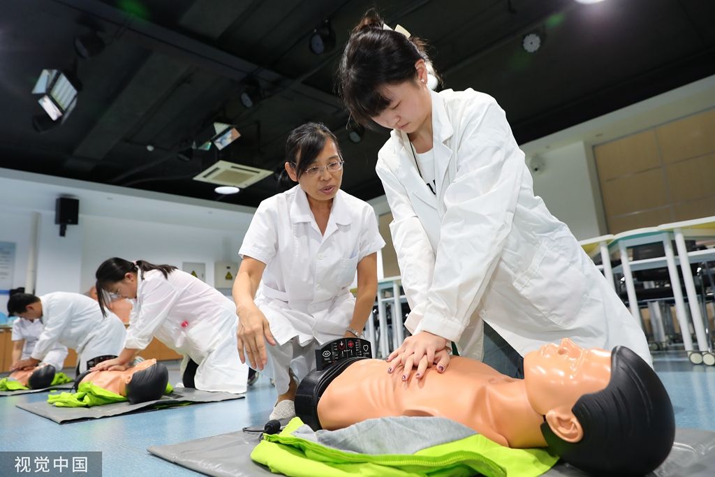 2023年9月2日,天津,学生在老师的带领下进行急救培训。