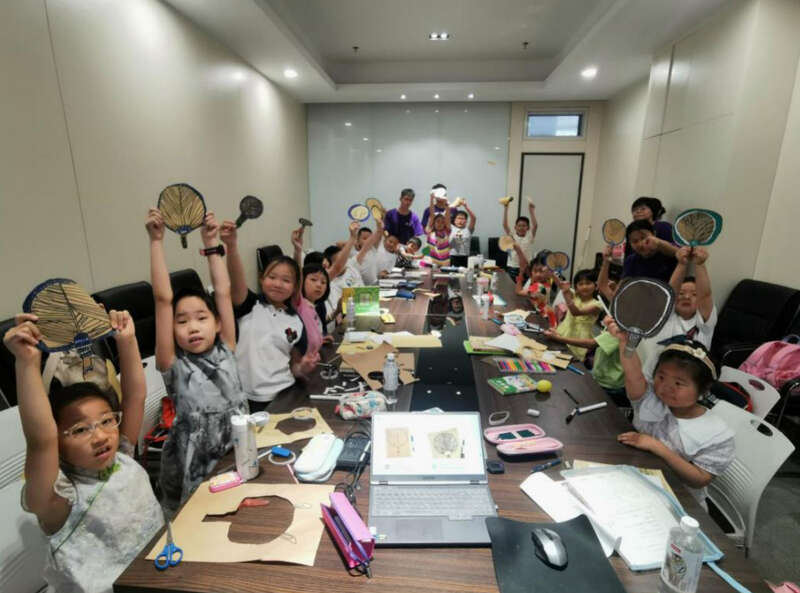 孩子们学习制作手工蒲扇。江苏省人民医院供图