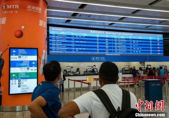 9月3日,台风“苏拉”的影响结束后,香港特别行政区往来内地的高速铁路服务恢复。图为旅客在高铁香港西九龙站关注电子屏显示的车次信息。中新社记者 侯宇 摄