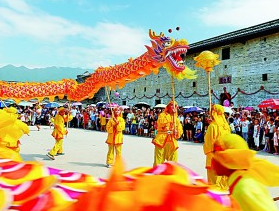 游客在安远县东生围欣赏客家文化民俗舞龙舞狮表演。郑敏摄/光明图片
