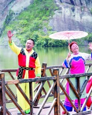 何良清(左)和刘丽在会昌县汉仙岩景区演唱会昌山歌《汉仙名气响当当》。本报记者 闫汇芳摄