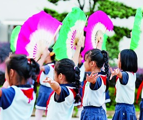 于都县九章路小学采茶舞社团正在排练赣南采茶舞《斑鸠调》。本报记者 闫汇芳摄