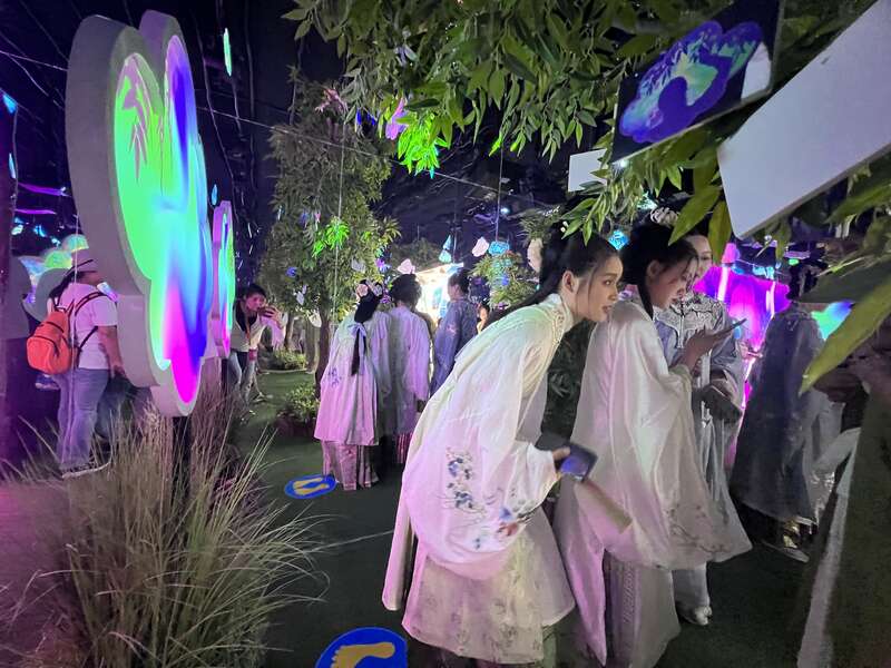中青报·中青网记者注意到,在文旅服务专题展区,一个用光影、植物打造的沉浸式拍照空间吸引不少观众,几位身着汉服的年轻女子拍照打卡,与背景十分相契合。正在拍照的陈晓宇说:“今年的服贸会元宇宙元素更多了,文旅展区体验感更强,像这样的拍照空间让人感觉很新奇,拍照也很好看,很多观众都愿意来拍照打卡。”