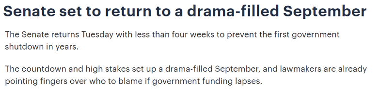 随着美国2023财政年度即将在9月30日终止,陆续返岗的两党议员们迎来了一年一度的“灾难性立法月”。
