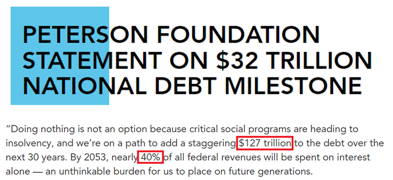 根据彼得森基金会的预测,美国在未来30年将在现有基础上再增加127万亿美元债务;到2053年,光是利息成本就要用掉近40%的联邦财政收入。