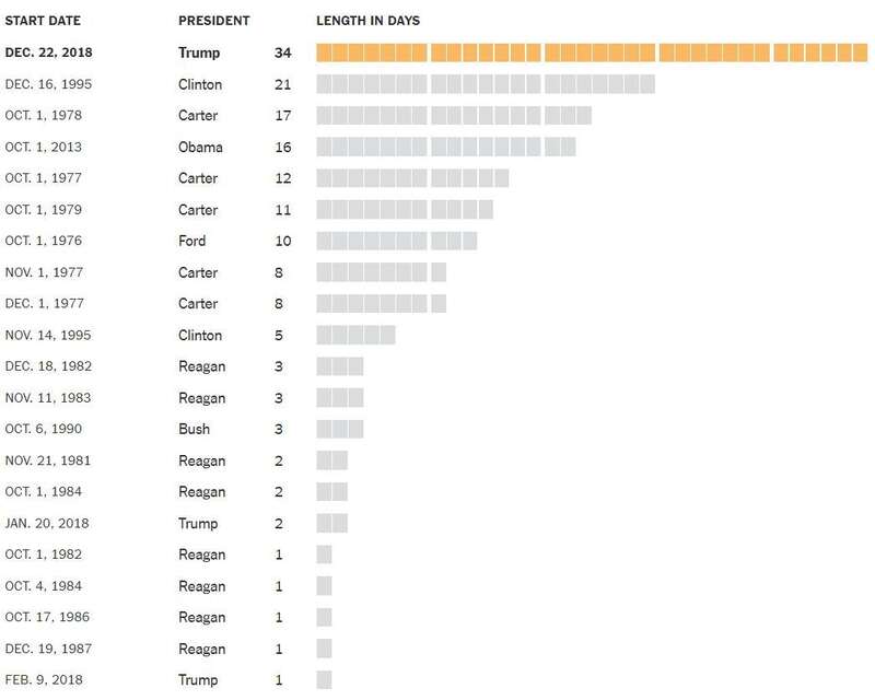 《纽约时报》列举了美国政府21次“停摆”的时间