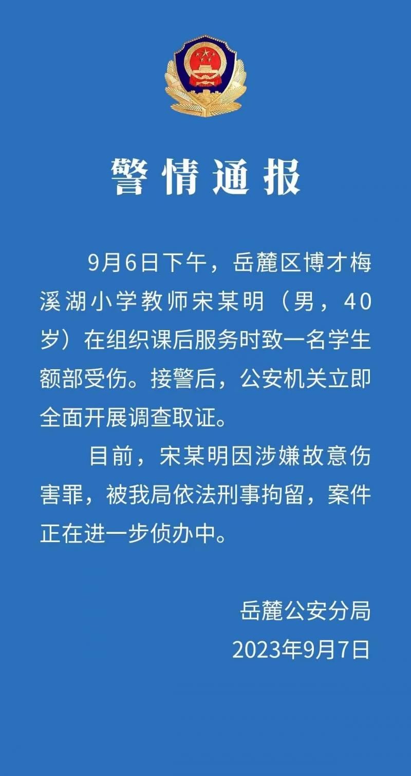 长沙岳麓警方:打伤学生老师涉嫌故意伤害罪被刑拘