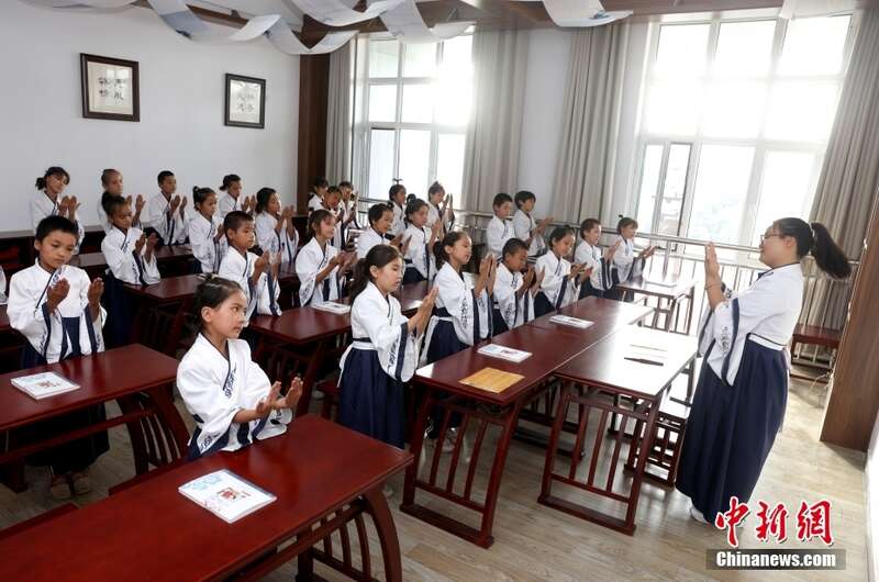 9月7日,甬库振兴村,孩子们身着汉服学习“三字经”及传统礼仪。