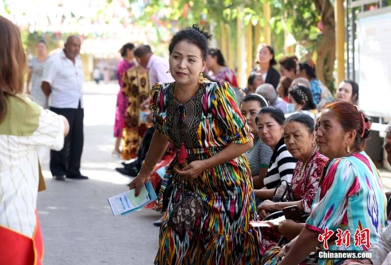 9月7日,浙江宁波援疆医生在甬库振兴村为村民义诊,村民排队看诊。