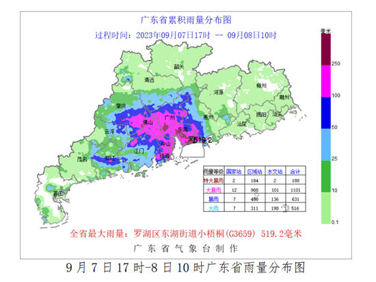 据广东天气网此前发布的消息,9月7日17时到8日10时,广东全省平均雨量53.1毫米,有79个镇街录得超过250毫米的特大暴雨,深圳罗湖区东湖街道录得全省最大雨量519.2毫米和最大1小时雨量116.8毫米。其余各市雨量最大的镇街有:东莞长安镇375.6毫米、佛山禅城区石湾镇街道372.1毫米、广州番禺区南村镇371.6毫米、肇庆高要区金利镇286.3毫米。预计8-9日,珠三角和粤西地区强降水持续,需注意防御强降水引发的内涝、中小河流洪水、山洪、泥石流、山体滑坡等灾害。