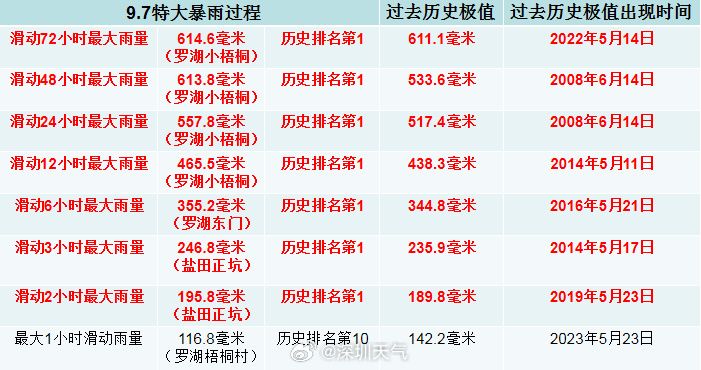 据微博@深圳天气 发布的消息,截至9月8日14时,此次特大暴雨过程中,深圳2小时最大雨量(195.8毫米)、3小时最大雨量(246.8毫米)、6小时最大雨量(349.7毫米)、12小时最大雨量(465.5毫米)、24小时最大雨量(524.4毫米)、48小时最大雨量(577.9毫米)、72小时最大雨量(614.6毫米),打破了深圳市1952年有气象记录以来7项历史极值。
