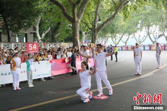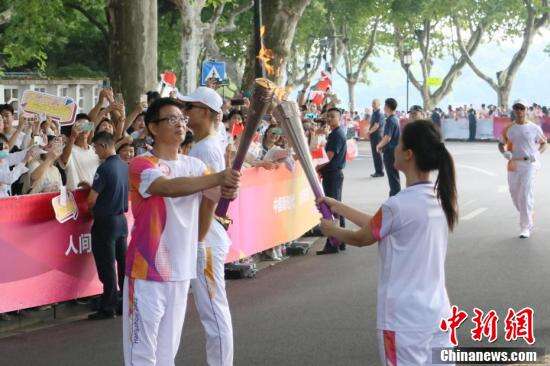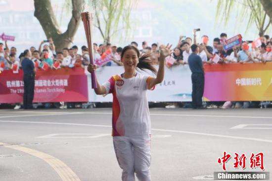 9月8日,杭州亚运会火炬传递活动启动,首日传递从杭州西湖涌金公园广场出发,沿南山路—湖滨路—环城西路—北山街—西泠桥—孤山路传递,在“西湖十景”之一的平湖秋月收火。图为南宋官窑瓷非遗传承人叶佳星传递火炬。