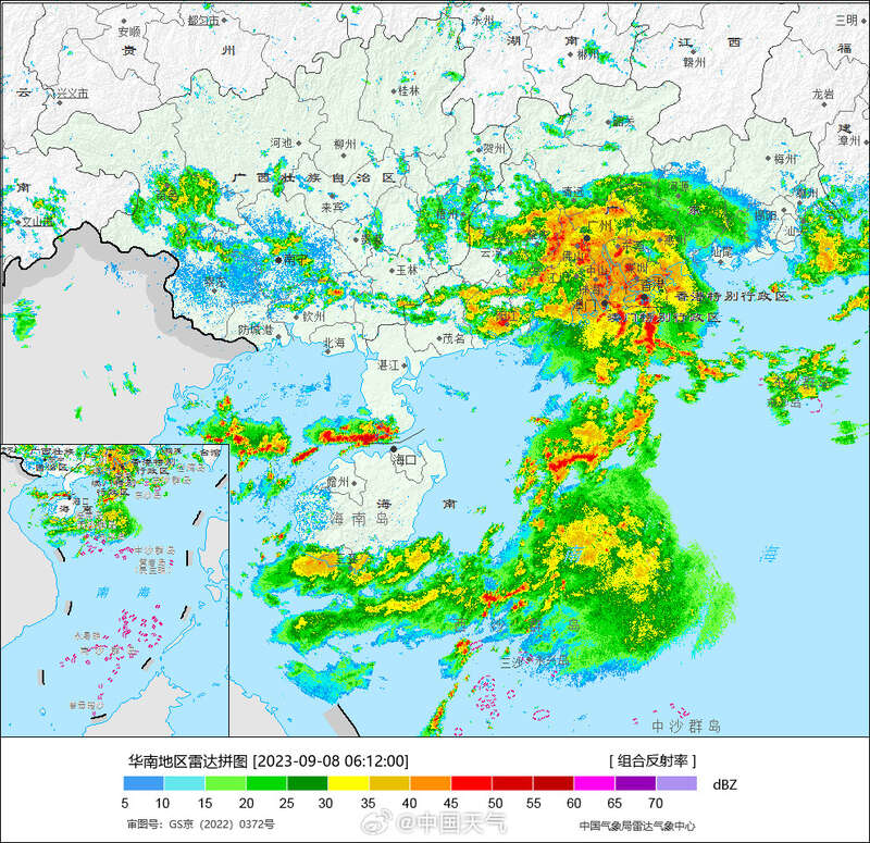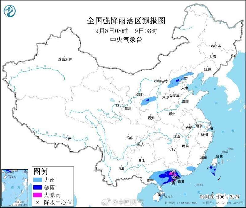 中央气象台9月8日06时继续发布暴雨黄色预警:预计,9月8日08时至9日08时,广东西南部和东部,广西东南部、海南东部和南部、台湾岛南部以及甘肃东部、陕西北部、河北中部、北京西部和北部等地部分地区有大到暴雨,其中,广东中部和西南部沿海等地部分地区有大暴雨(100~180毫米)。上述部分地区伴有短时强降水(最大小时降雨量20~50毫米,局地可超过80毫米),局地有雷暴大风等强对流天气。