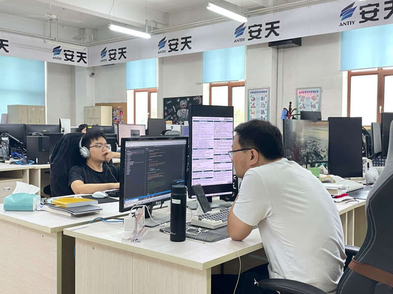 双屏电脑、竖屏电脑、笔记本电脑,安天科技的每个工位上都至少摆放着两台电脑。记者看到,一排排电脑前,一群朝气蓬勃的年轻人,手指轻快地在键盘上移动,快速穿行于网络世界,用他们的智慧构建起网络安全防护屏障。