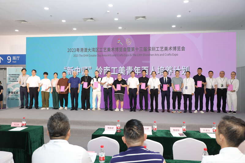 值得一提的是,广东省工艺美术协会、广东省工艺美术珍品馆于2019年联合推出“新中坚——岭南工美青年百人培养计划”, 本次展会期间,还举办了第五届新中坚“十杰”人才授牌仪式,来自刺绣、陶瓷、手拉壶、雕刻等不同工艺领域的十名优秀青年艺术家作为第五届新中坚“十杰”人才集体亮相。