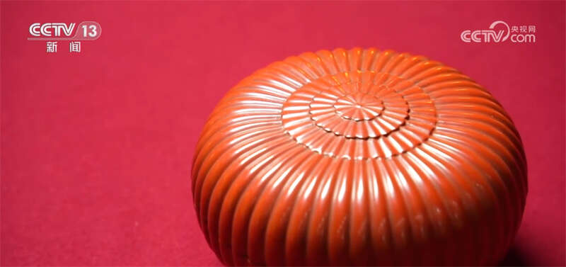 总台记者 杨雪:与多穆壶一样,很多文物都是逐渐从生活用品演化成为艺术品的。像我们眼前看到的这一款清乾隆款朱漆菊瓣盒就是其中之一。它本来是盛放像干果、小点心等这些小件物品的盒子,在不断使用的过程中,逐渐演化成为了宫廷艺术品。
