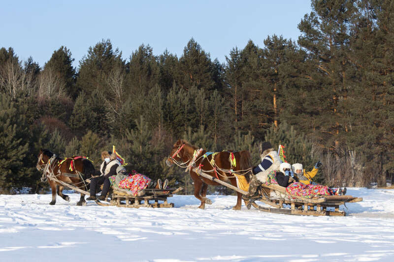 当地村民用马拉爬犁带游客游玩北极村(2021年1月13日摄)。