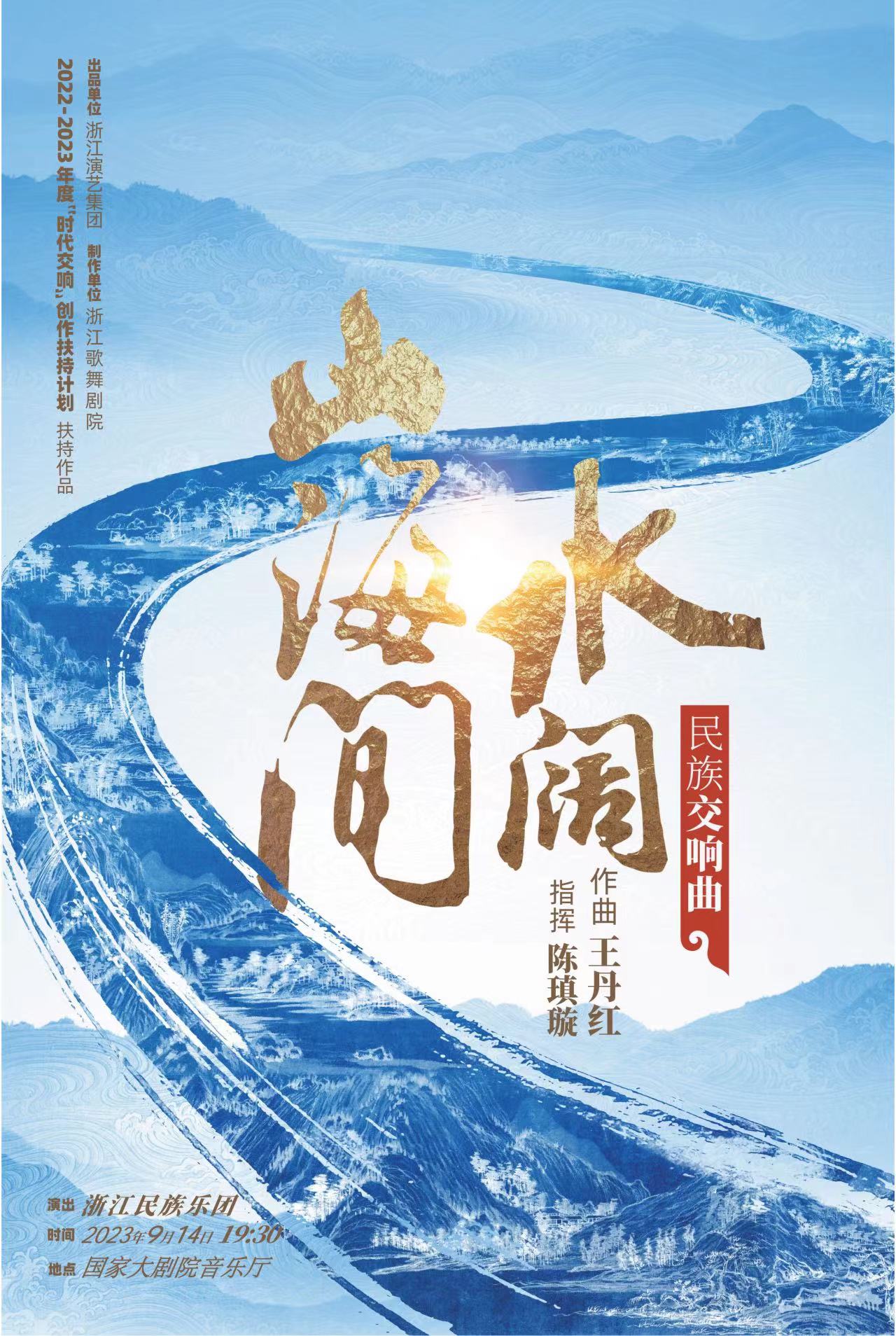 民族交响曲《水阔山海间》由序曲《一苇杭之》、第一乐章《水至》、第二乐章《山望》、第三乐章《闹花台》、第四乐章《缘会》、终曲《水阔山海间》等6个乐章构成,是作曲家王丹红历时三年,到浙江实地采风创作而成。作品以水之名,依水为路,寻溯钱塘潮涌的源头起点,构筑之江儿女的心灵家园。
