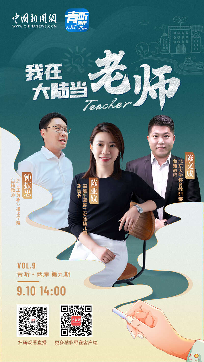 教师节这天,北京大学体育教研部教师陈文成、浙江工贸职业技术学院教师钟振忠、福建平潭第二实验幼儿园副园长陈亚妏,三位台籍教师做客中国新闻网《青听·两岸》栏目,分享了他们“登陆”做老师的故事。