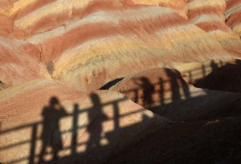 9月11日,甘肃张掖,游客们的剪影投射在丹霞地貌上。刘占崑/摄