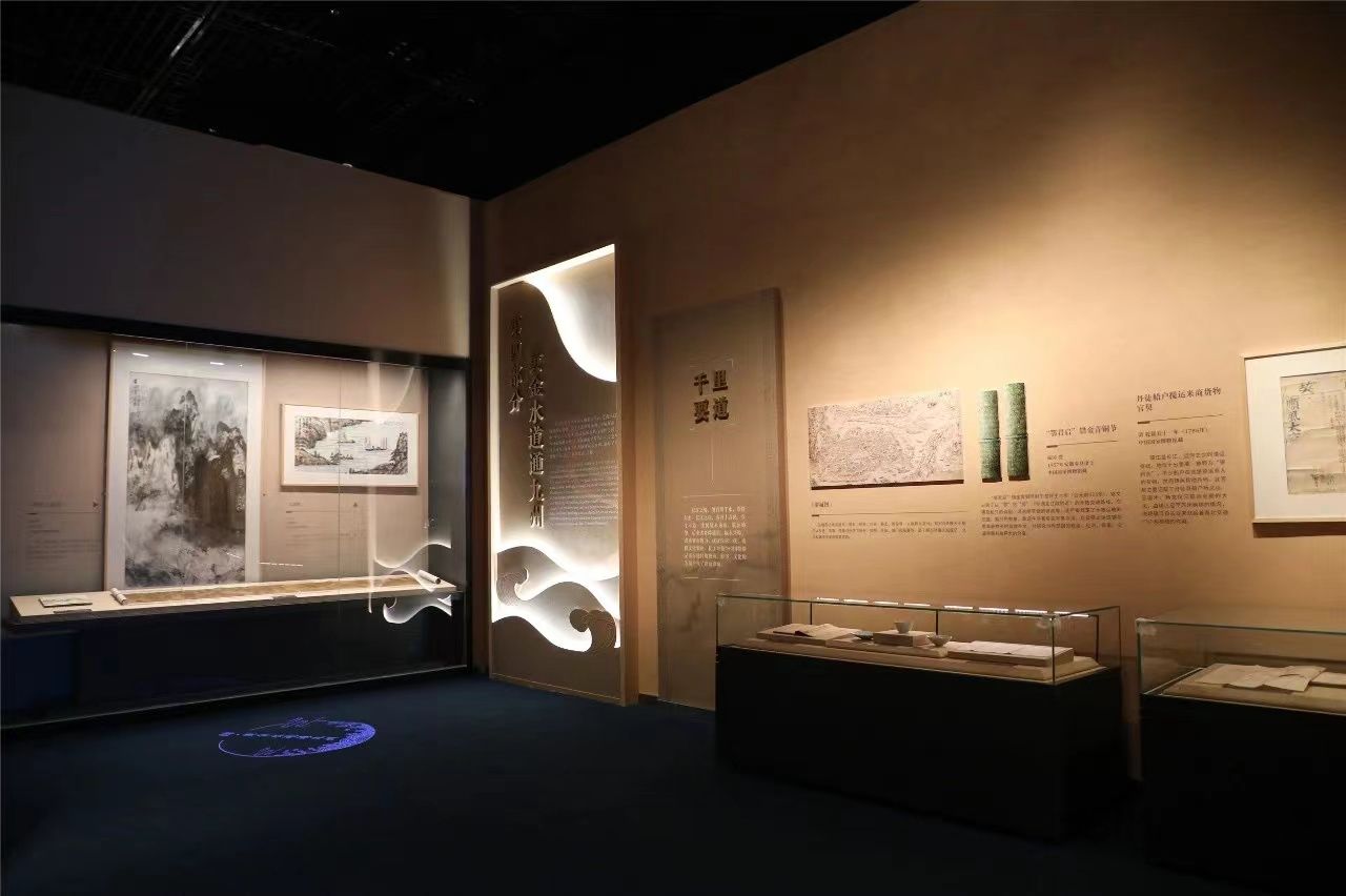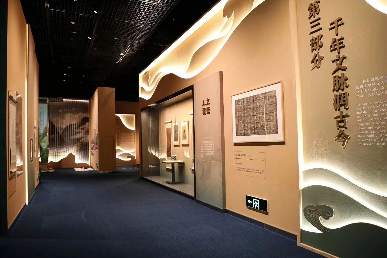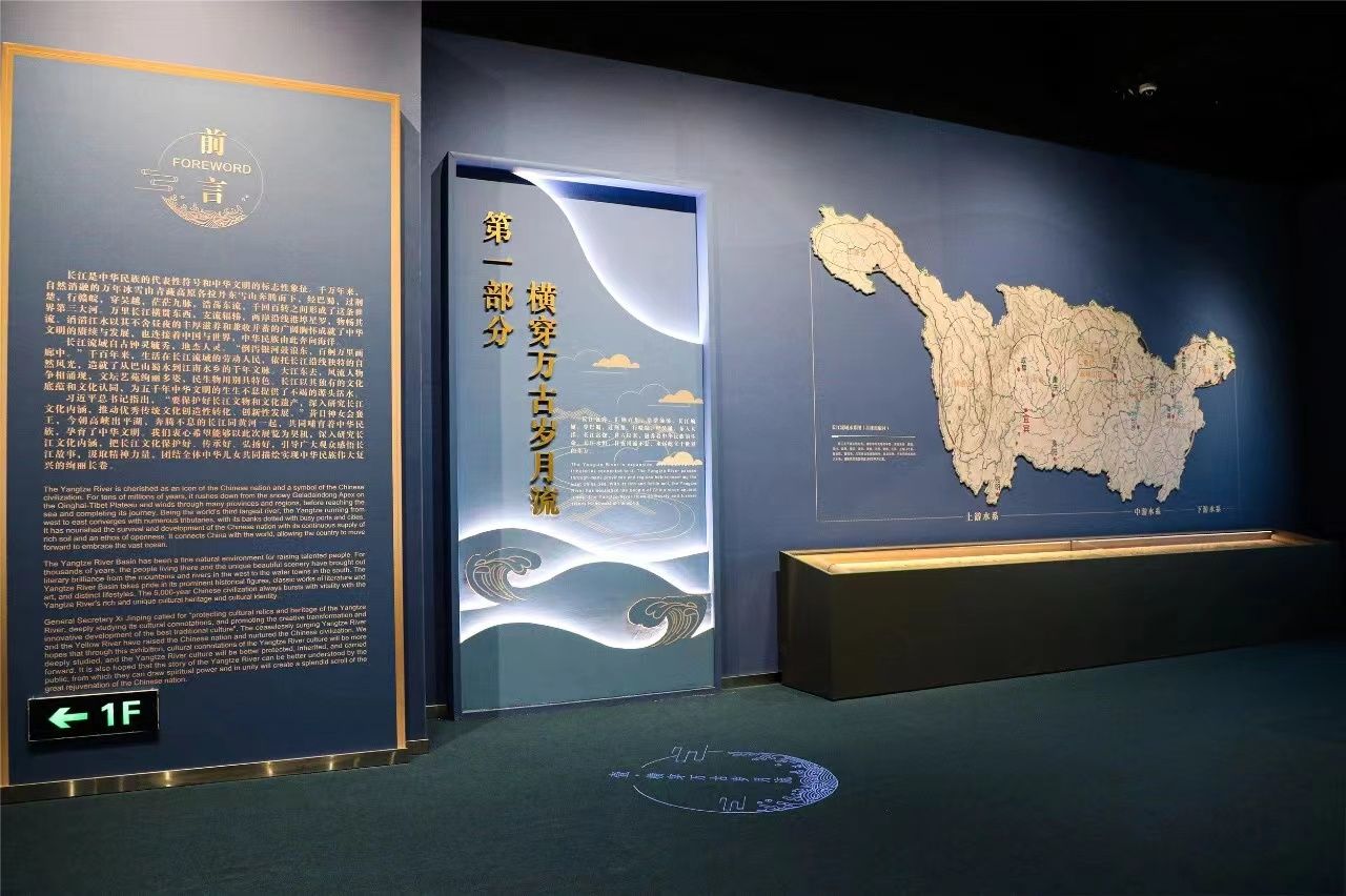 新石器时代良渚文化青玉璧、青玉琮,来自三星堆古蜀文化遗址商代青铜人头像,《万里长江图》《长江万里图》等长卷名画……本次巡展汇集了130余件/套各类材质的长江文化代表性物证,内容丰富,展品多样,较为全面的反映了长江文化的内容。展览以“横穿万古岁月流”“文明传承绵延长”“千年文脉润古今”“黄金水道通九州”“长江首城醉宜宾”五个单元全面展示长江的历史之久、人文之盛、生态之美,赓续中华民族历史文脉,坚定全民族文化自信。与此同时,展览设计中融入“长江”元素,提取江水的色彩和形态,选取蓝绿作为主色调,加之古画纸色,进行艺术化诠释,以意赋象,以江水流淌的曲线,构建出灵动、延伸的空间场景。辅以部分多媒体展项,通过“文物+科技”的手段带给观众一场多感观的长江文化盛宴。