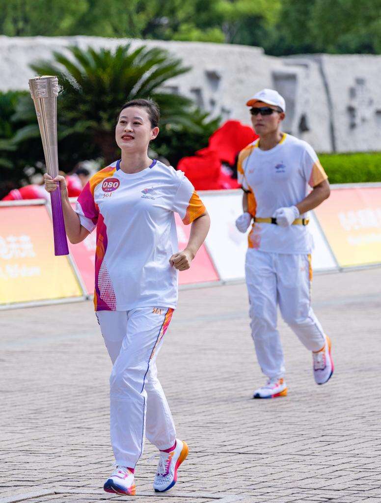10日嘉兴站,南湖革命纪念馆的讲解员袁晶在馆前接过火炬时,讲解了20多年革命故事的她增添了一份作为亚运火炬手的荣誉和自豪。袁晶还担任嘉兴市多所中小学校的校外辅导员和选修课程主讲人,积极开展《红船驶进中国梦》《革命精神记心间,民族精神代代传》《红船的故事》等主题讲座,引导孩子们读懂初心与信仰。