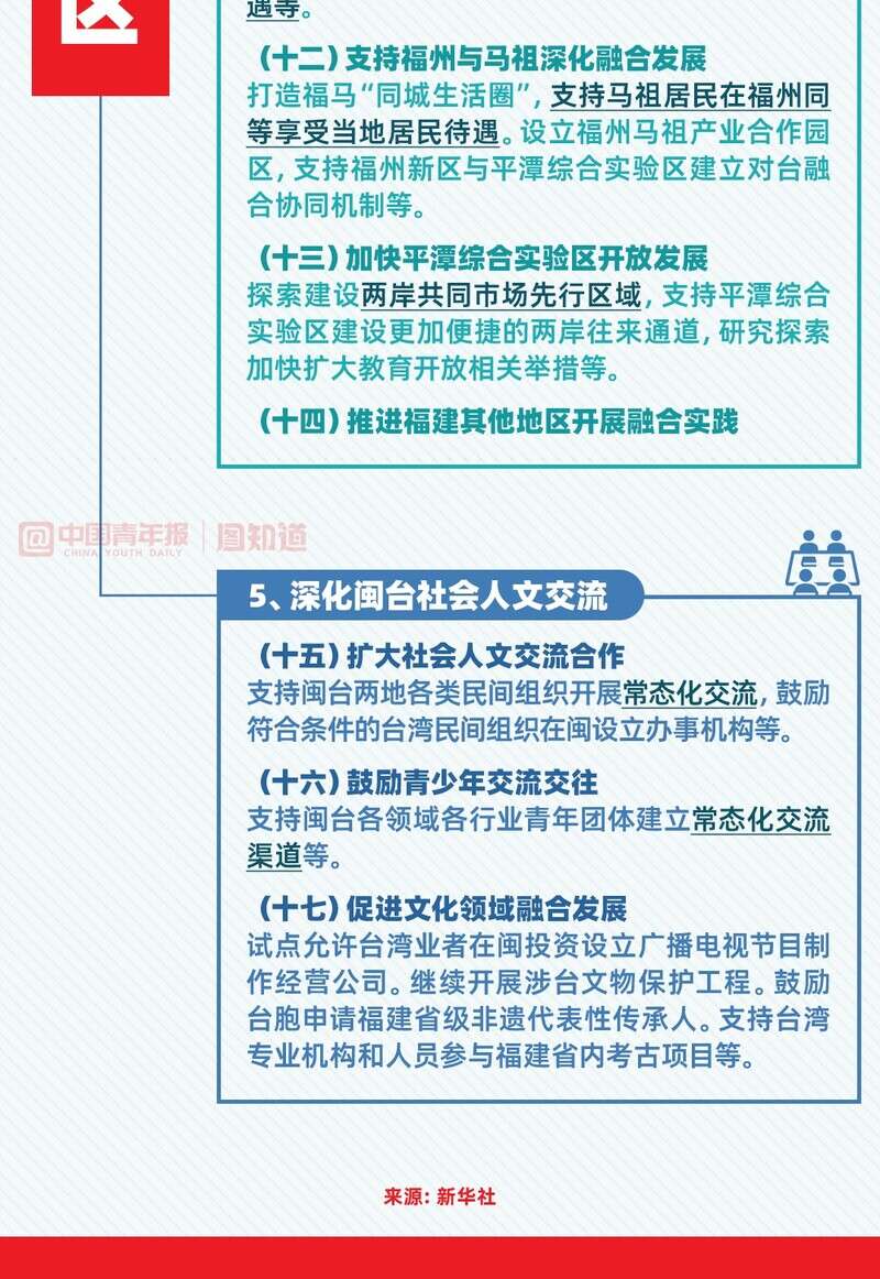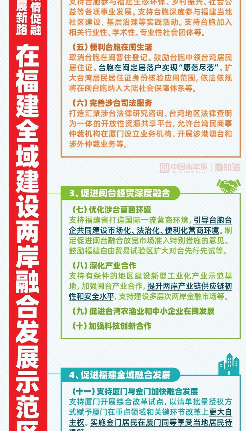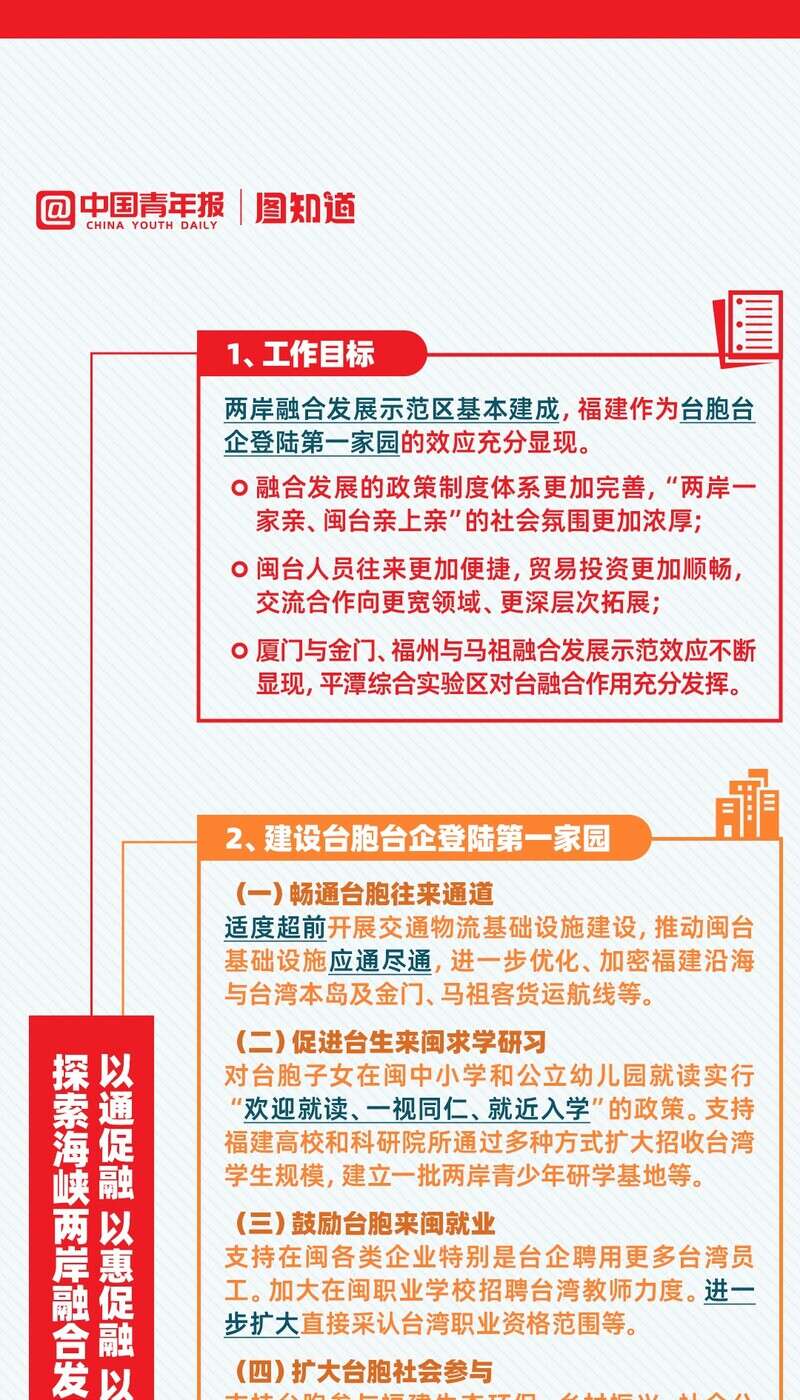 为深化两岸各领域融合发展,推进祖国和平统一进程,中共中央、国务院近日印发《关于支持福建探索海峡两岸融合发展新路 建设两岸融合发展示范区的意见》,以通促融、以惠促融、以情促融,有哪些最新措施,一图了解收藏。
