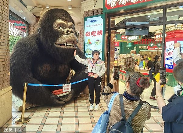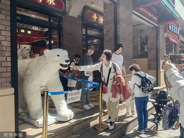 在西四道街与中央大街交口附近,一商家在门口放置了高大威猛的大猩猩和憨态可掬的北极熊仿真模型,它们的嘴可以张开、闭合,脖子也能转动,吸引许多游客观看拍照。