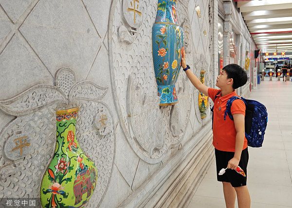 2023年9月11日,北京平安里地铁站,一名小乘客在观看中国风浮雕。北京一些地铁站设计独特,风格各异。
