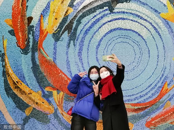 2022年1月2日,北京地铁金鱼胡同站,金鱼特色地标吸引乘客拍照留念。