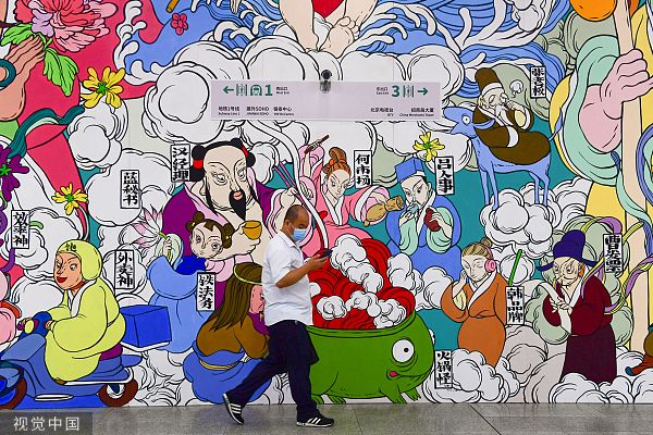 2020年8月19日,北京,国贸地铁站,市民路过巨型壁画《众神上班图》。