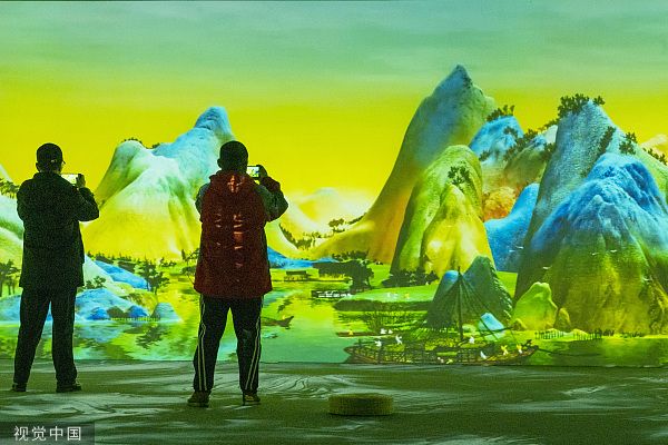 2023年2月22日,成都,全国首个地铁数字艺术空间在成都地铁东大路站亮相,空间通过糅合传统美学与全息投影等数字科技,将中国北宋画家王希孟的《千里江山图》呈现给民众。参观者近距离感受和拍摄“动起来”的名画。 中新社记者 刘忠俊 摄