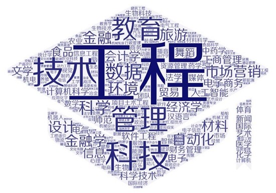 《2022大学生微创业行动项目分析报告》显示,1081个创业团队成员专业构成丰富多样,通过对专业进行词频统计和词云图绘制,其中最为突出的5个词语分别是“工程”“技术”“科技”“管理”“教育”。