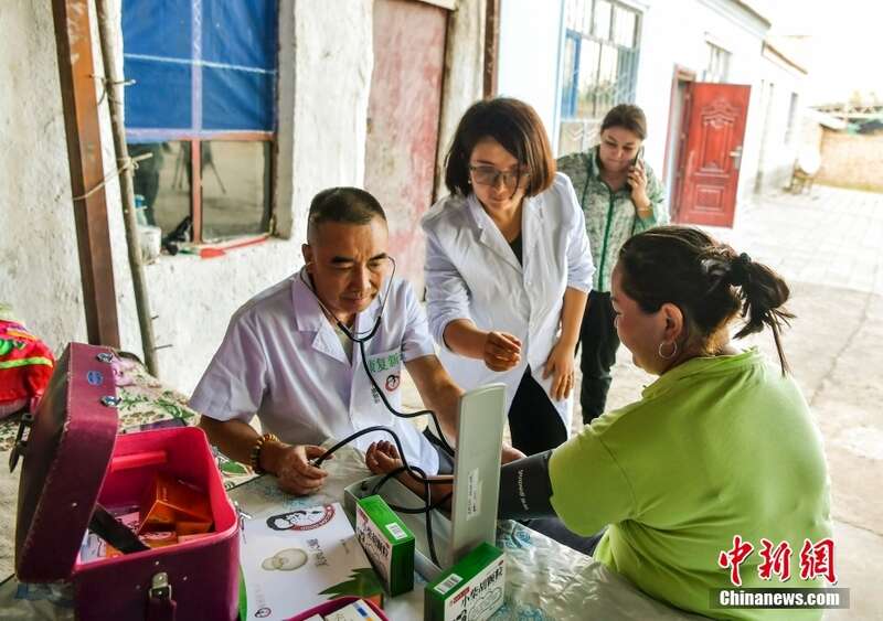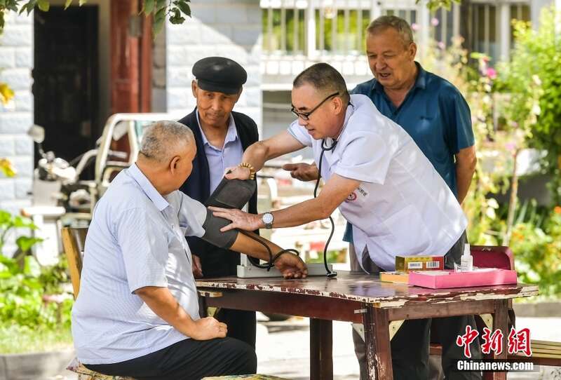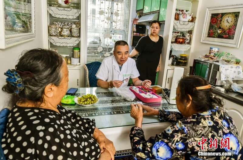 新疆塔城地区沙湾市一小区,乡村医生谷平为不方便外出就诊的患者提供上门服务。