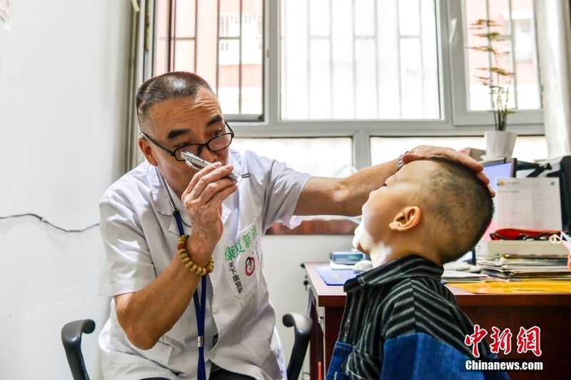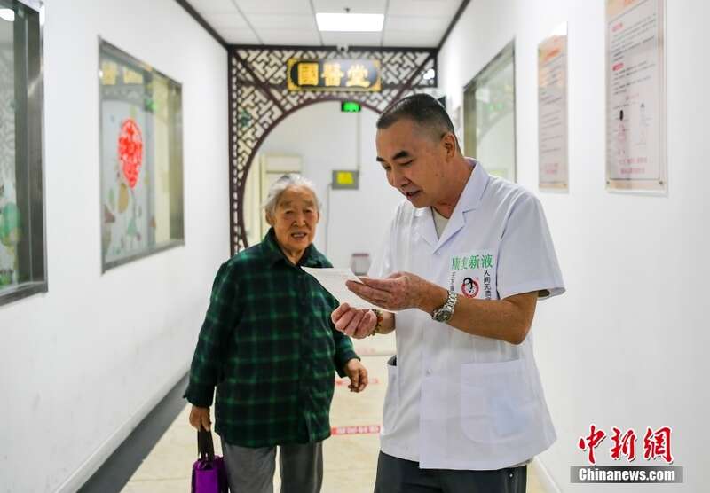 乡村医生谷平在诊所里为前来体检的老人提供帮助。
