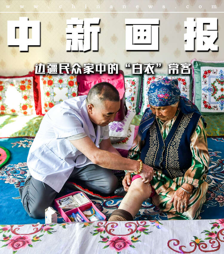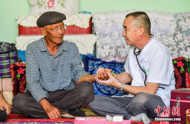图为新疆塔城地区沙湾市博尔通古乡,乡村医生谷平(左)为阿依恒·胡瓦尼巴依80多岁的母亲进行针灸,治疗腿部疾病。
