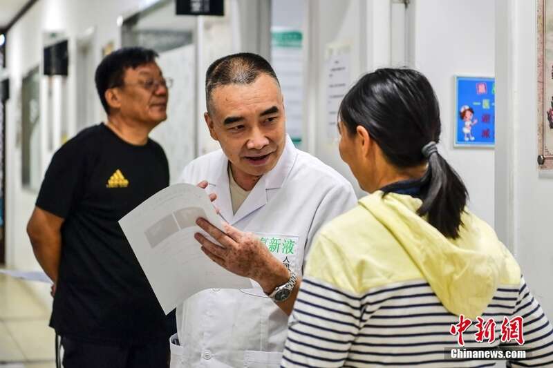 乡村医生谷平(中)在诊所里向体检的市民讲解检查结果。