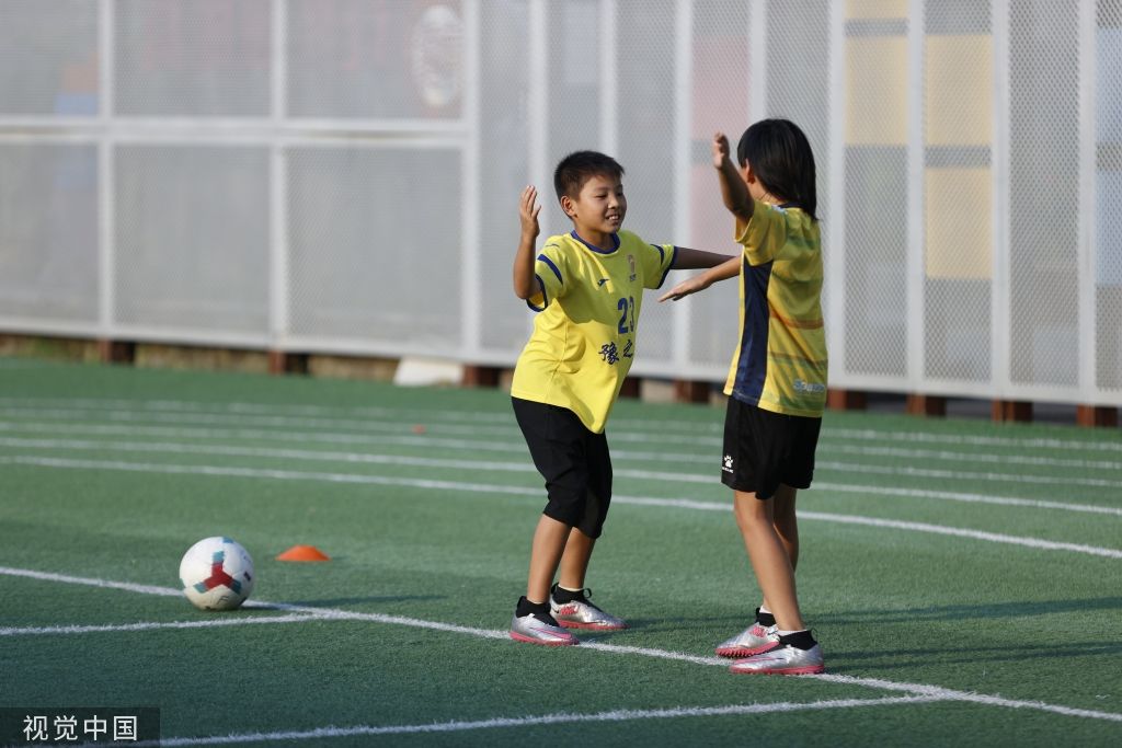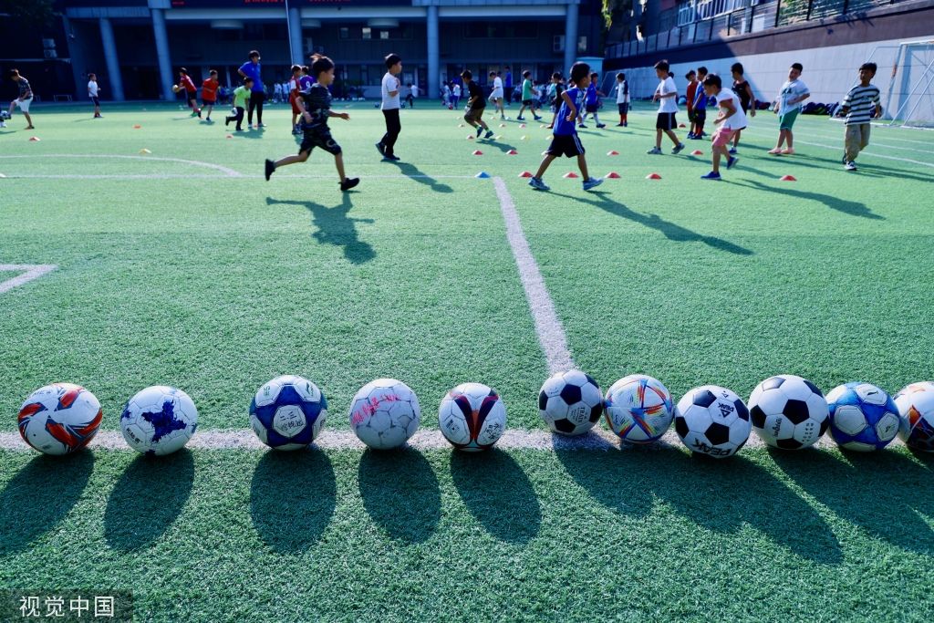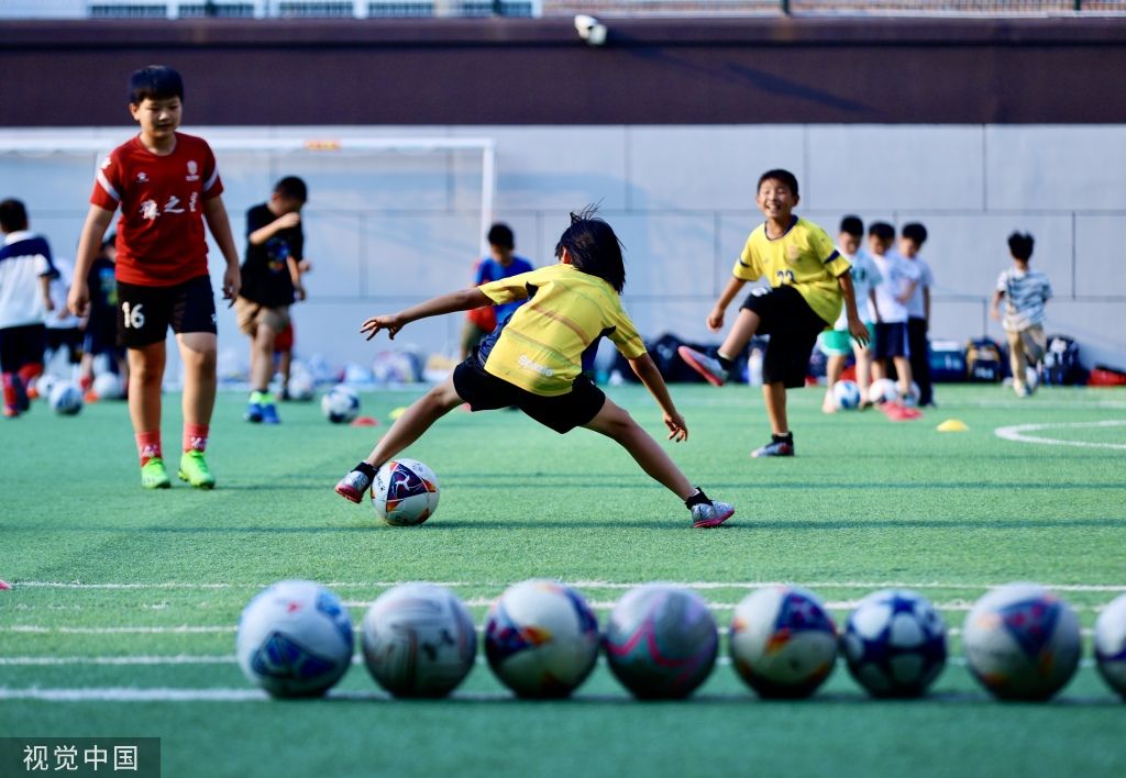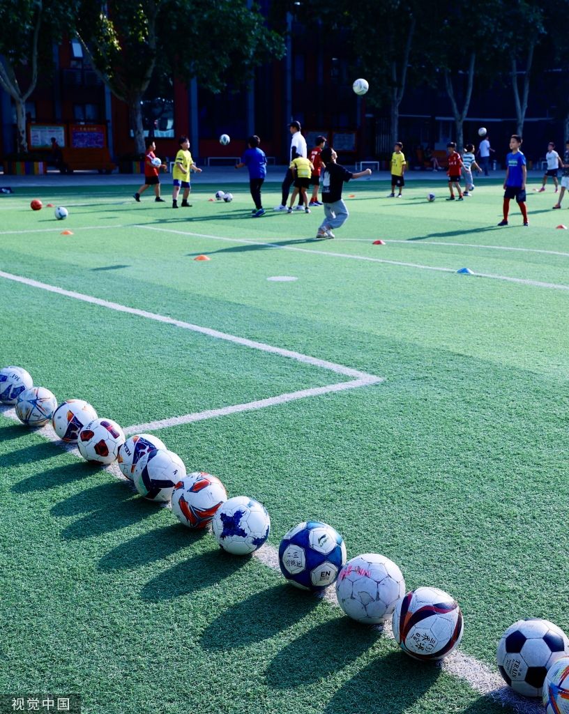 2023年9月14日,郑州市管城回族区实验小学,放学后,参加延时足球社团的小学生在练习足球。