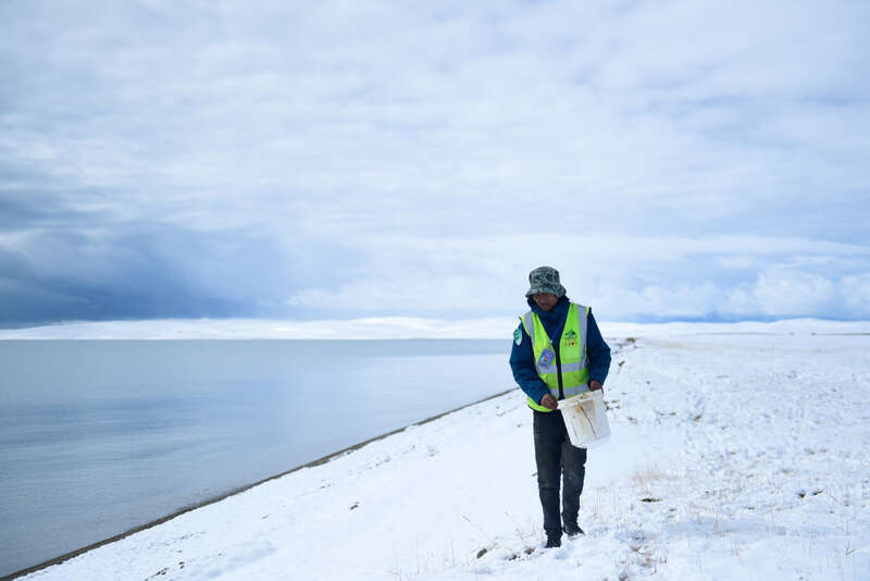 近年来,玛多县实施“以草定畜”政策,科学合理利用草原,探索现代生态草原畜牧业发展之路。和许多牧民一样,同德放下牧鞭,如今他的工作是捡拾垃圾、巡护湖泊和草原、保护野生动物。
